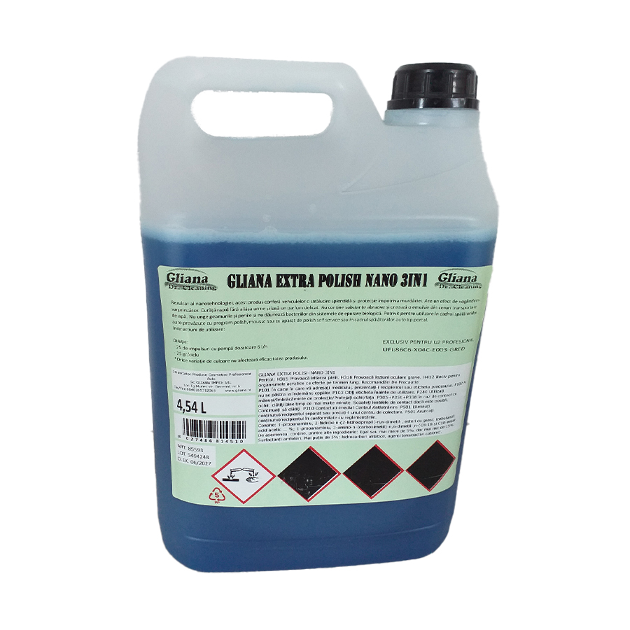 Extar Polishnano 3 in 1 este un produs pentru pre-spalare, spalare si lustruire, special conceput pe baza de nano tehnologie, cu o spumare puternica si lustruire pe baza de nano-folii, cu un efect deosebit de lustruire si protectie de lunga durata. Este o spuma cu efect de polish care confera o putere de reflexie extraordinara vopselei auto, nu contine substante abrazive, creeaza o emulsie de ceruri nanotructurate transportate de apa. Este un produs conceput pentru a fi utilizat in instalatii de spalare auto echipate cu instalatie de lustruire (polishare) spumoasa. Nu lasa urme de grasime pe ferestre sau perii si este compatibil cu sistemele biologice de epurare.